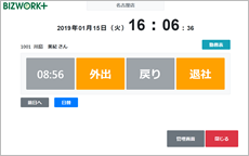 カード認証後の画面にて操作ボタン(出社・外出・戻り・退社)を選択。